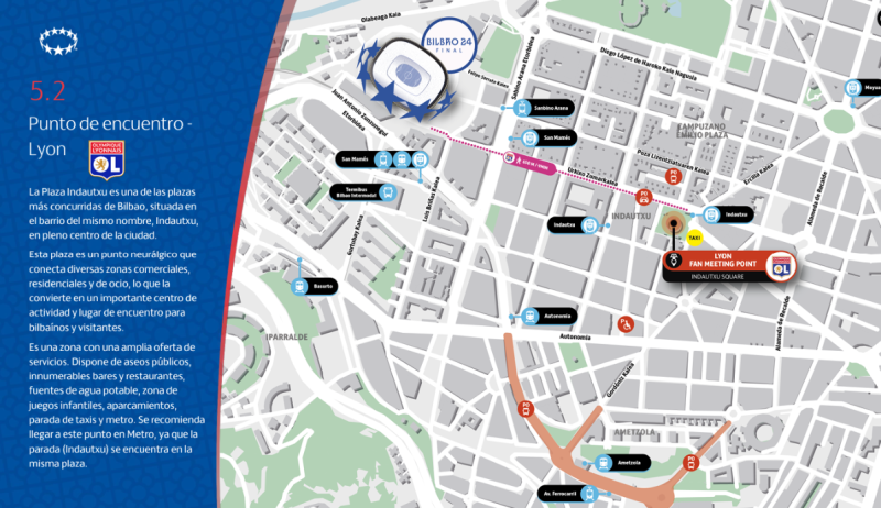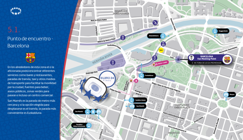 Y las rutas peatonales, que estarán señalizadas para que los y las aficionadas dispongan de itinerarios peatonales seguros, entre estos puntos de encuentro y el estado de San Mamés.